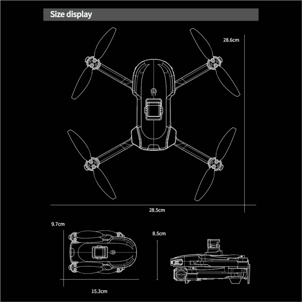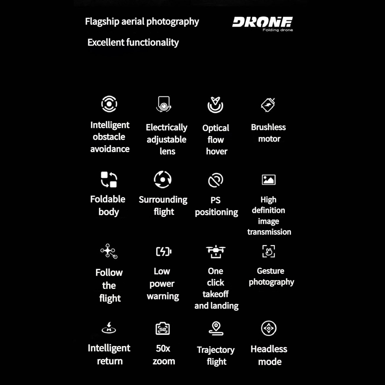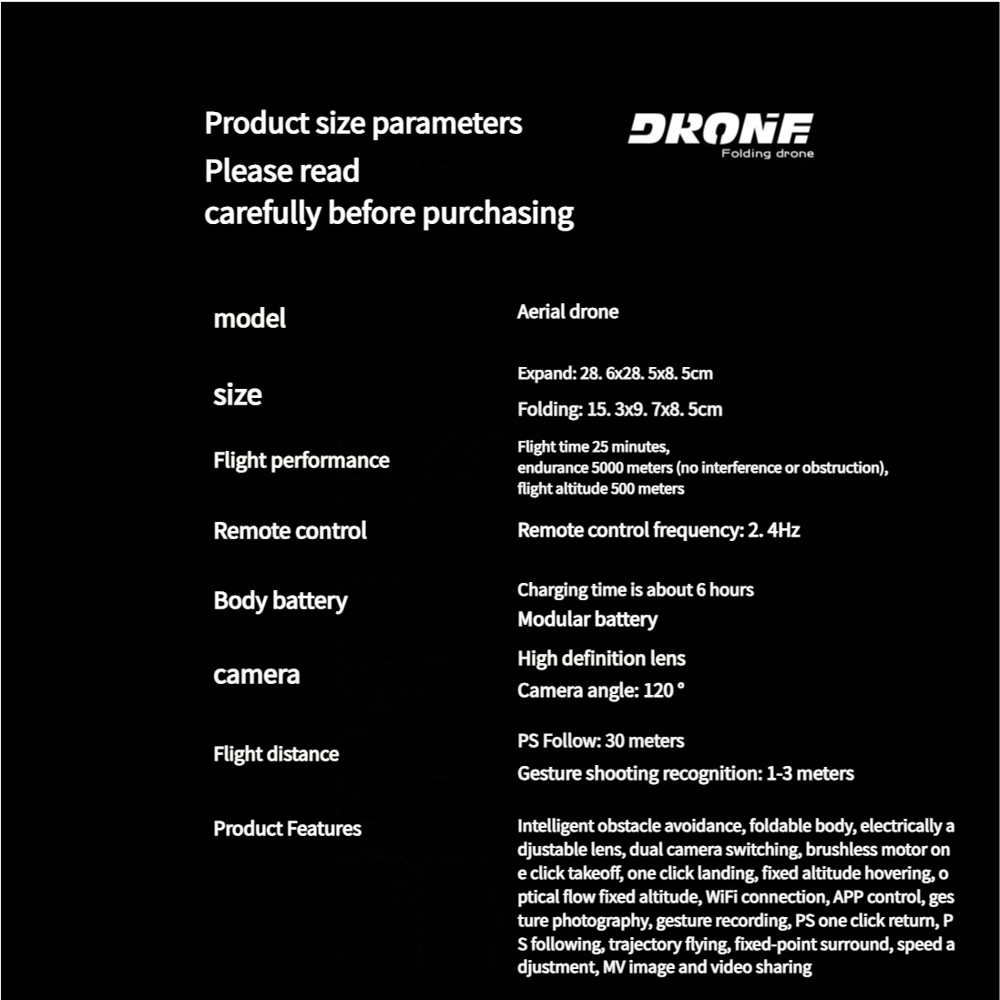 Features: intelligent obstacle avoidance, body folding, ESC lens, dual-camera switching, brushless motor, one-key takeoff, one-key landing, fixed-height hovering, optical flow fixed-height, WiFi connectivity, APP control, gesture photo, gesture video, GPS one-key return, GPS follow, trajectory flight, fixed-point surround, speed adjustment, MV picture and video sharing