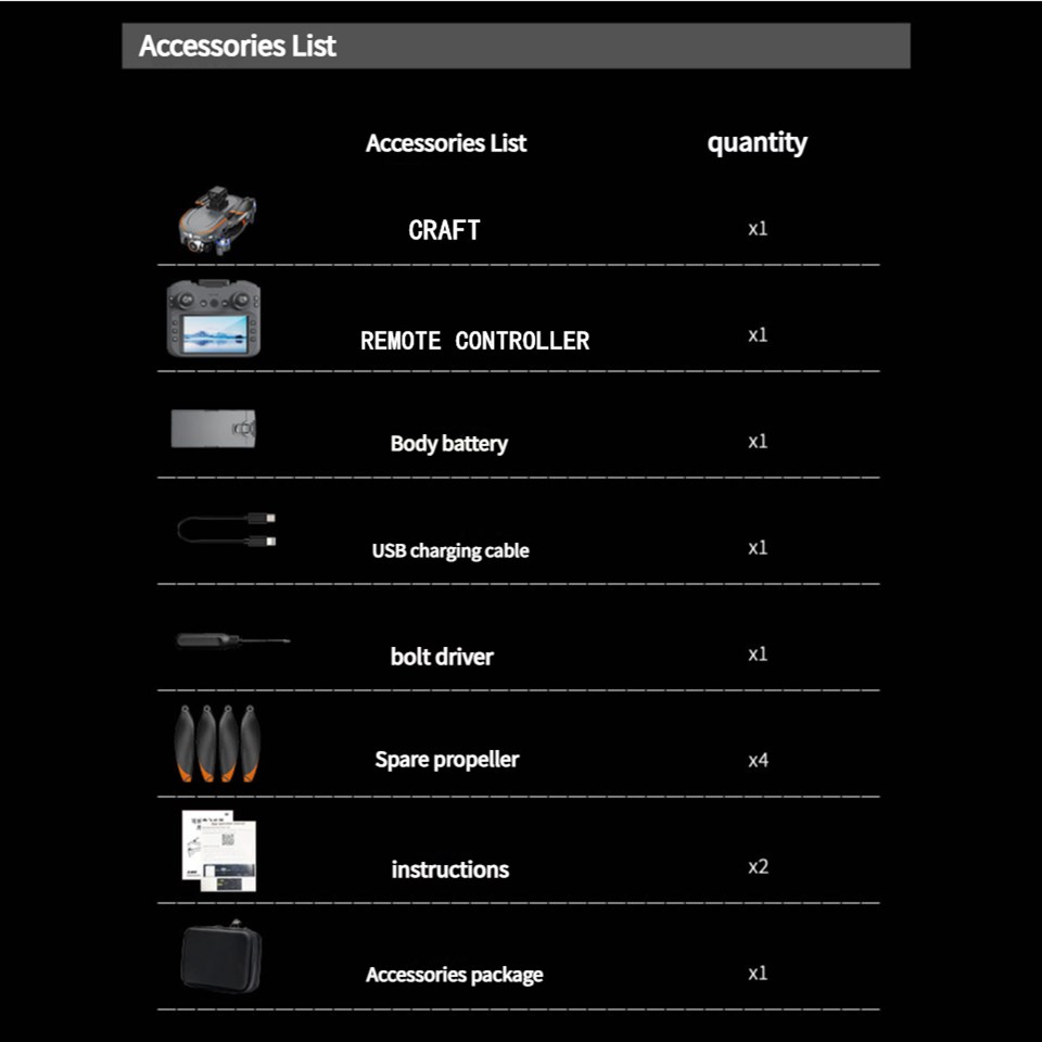 Packing list: drone *1, remote control *1, battery *2, spare paddle *4, memory card *1, card reader *1, USB charging cable *1, manual *2, accessory kit *1