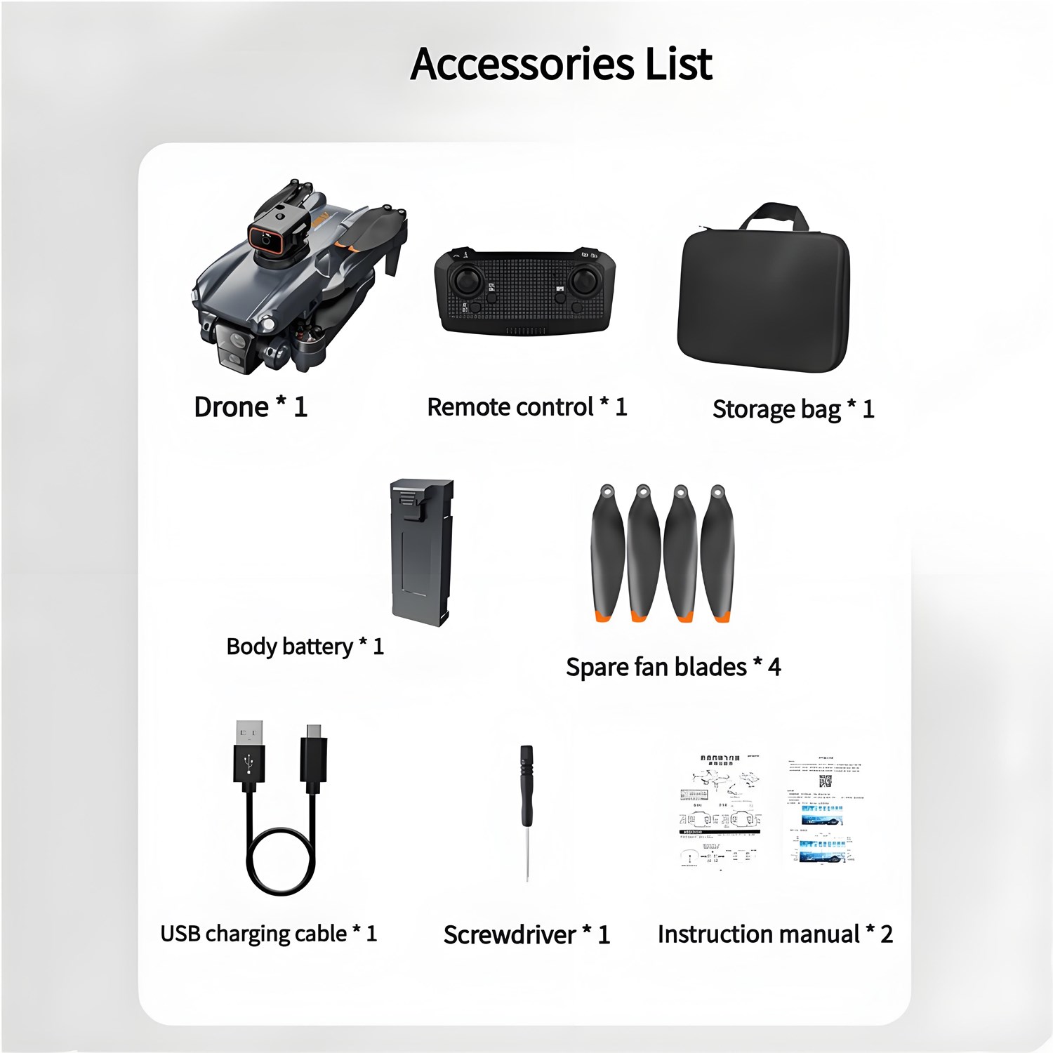 Packing list: drone * 1, remote control * 1, obstacle avoidance head * 1 (obstacle avoidance package), body batteries * 1, storage bag * 1, color box * 1, manual * 2, spare wind blade * 4, USB charging cable * 1, screwdriver * 1
