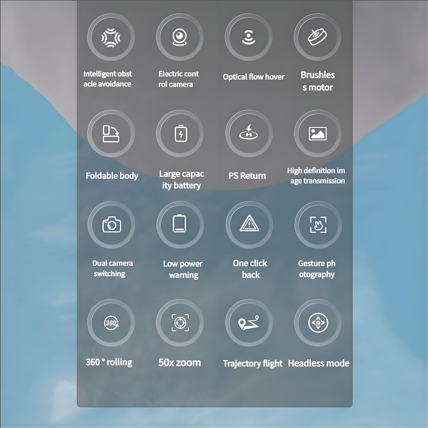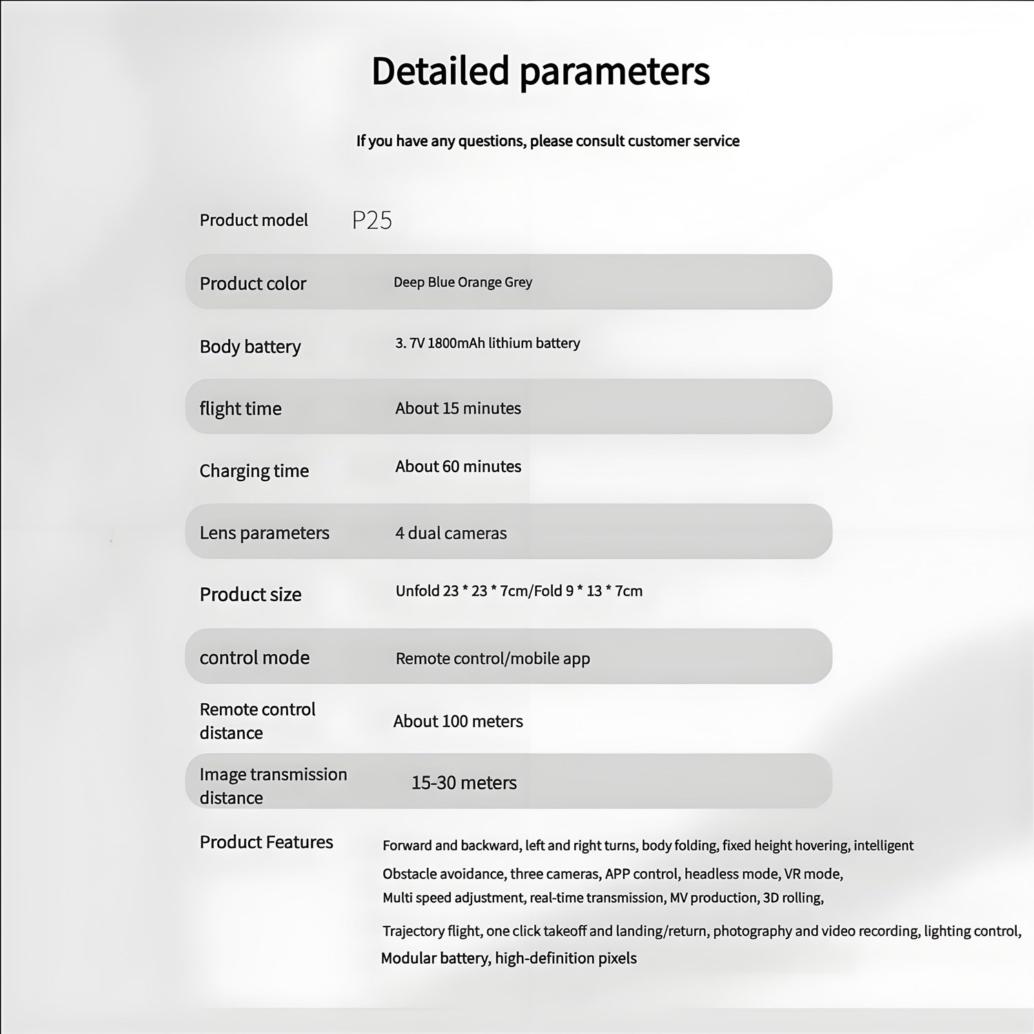 Features: forward and backward, turn left and right, body folding, fixed height hovering, intelligent obstacle avoidance, ESC three cameras, APP control, headless mode, VR mode, multi-speed adjustment, real-time transmission, MV production, 3D tumbling trajectory flight, one-key take-off and landing/returning, photo and video recording, light control, modular batteries, GPS positioning and returning, optical flow fixed height, brushless motor, HD pixels.