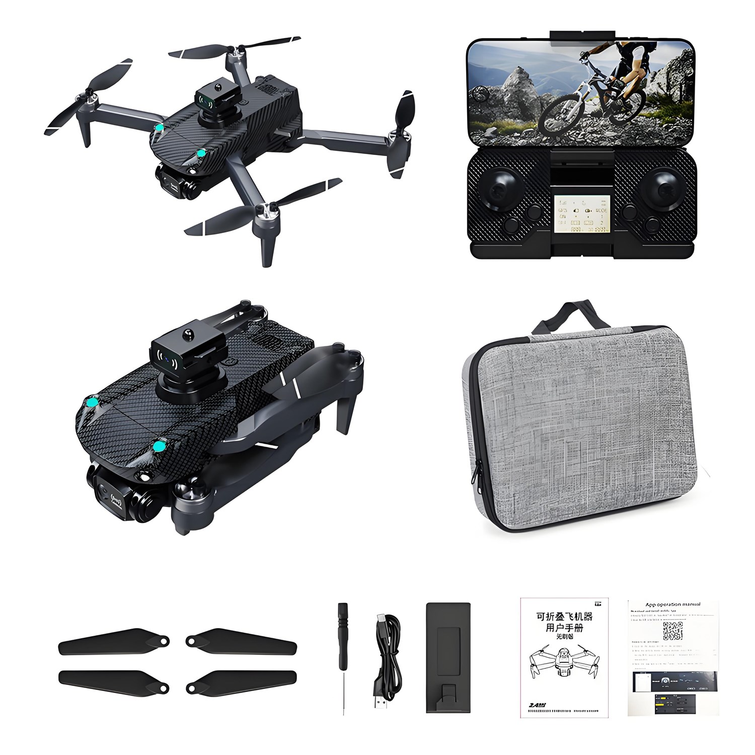 Packing list: drone *1, battery *1, remote control *1, obstacle avoidance device *1, fan blade *4 small pieces, USB cable *1, screwdriver *1, manual *2,