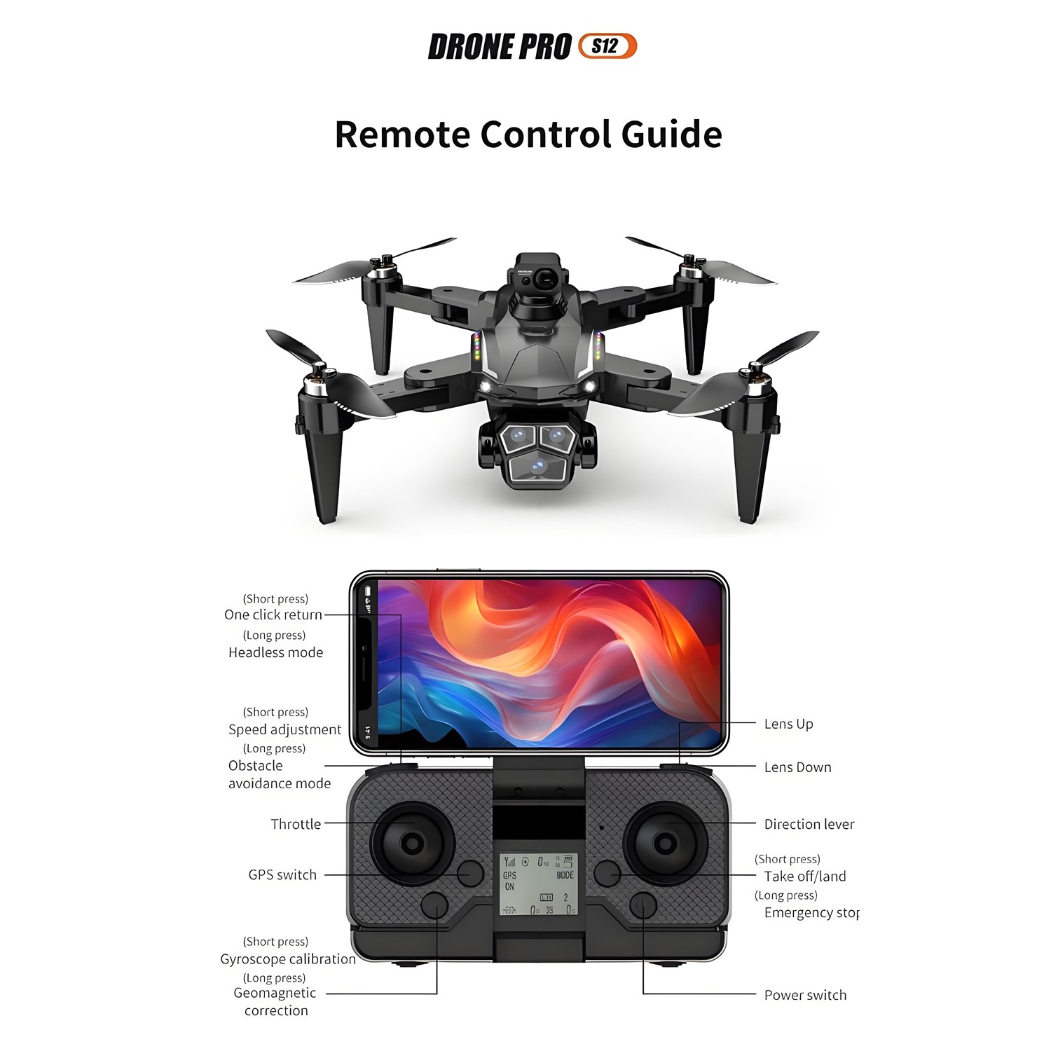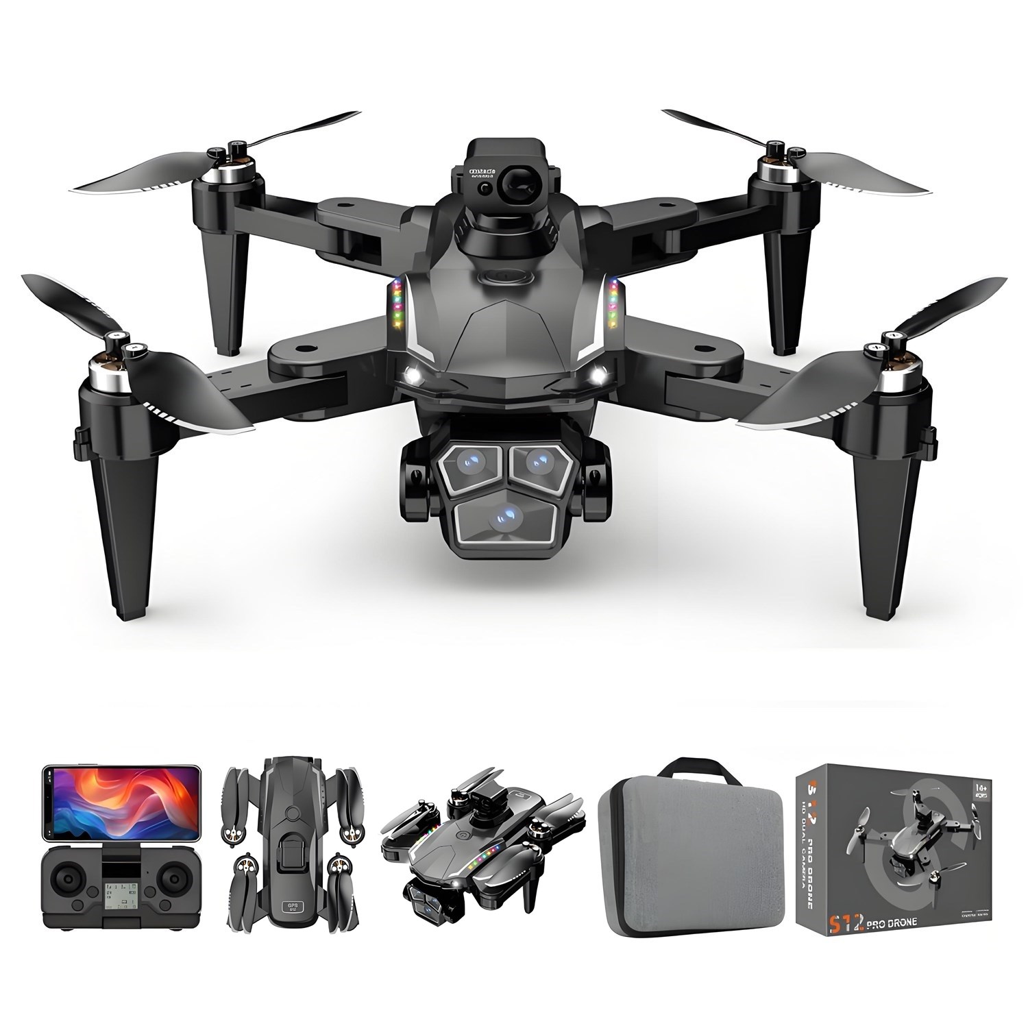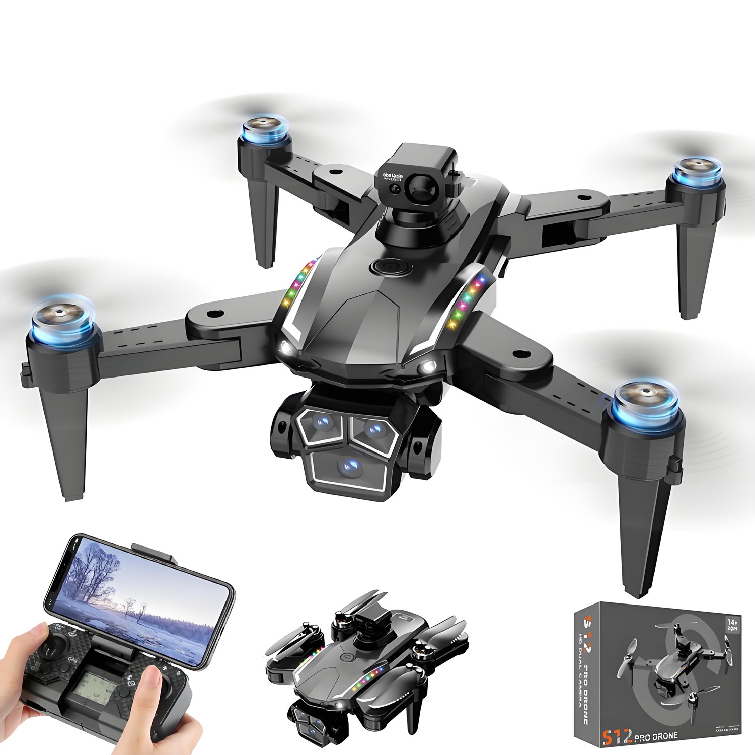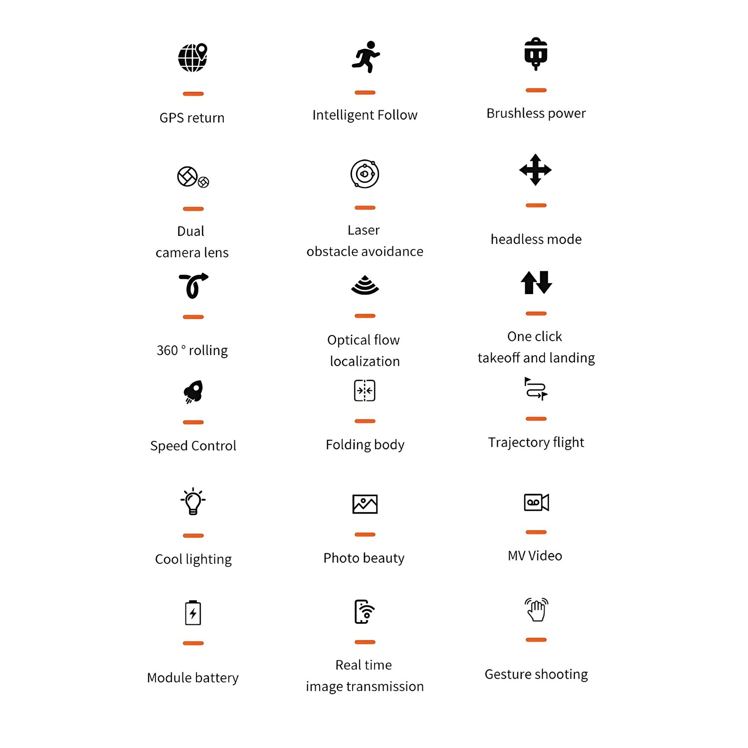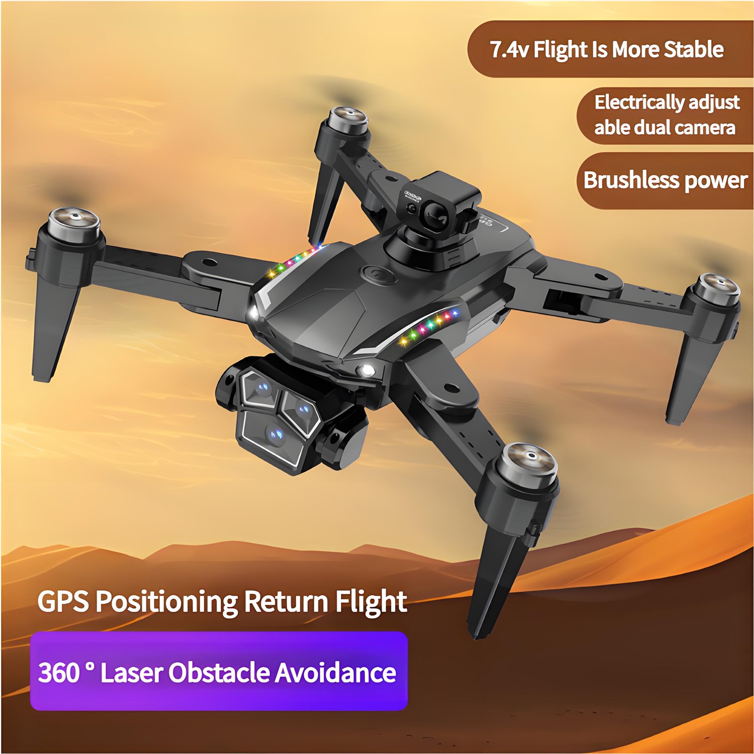 Features: brushless power, four-way obstacle avoidance, GPS automatic return, low battery return, camera can be remotely adjusted electrically 90 °, 7.4V high-capacity battery, 22 minutes of long endurance, fixed height function, the aircraft can be folded, six-pass with a gyroscope, a key to calibrate, a key to take off, a key to land, rise and fall, forward and backward, left and right sideways flying, steering, headless mode, fuselage lights / nose lights (camera can be added) Functions: gesture photo, video, headless mode, emergency stop, trajectory flight, gravity sensing, music, 50x zoom, automatic photo), dual camera lenses, intelligent following, laser obstacle avoidance, headless mode, 360 ° roll, optical flow positioning, one key takeoff and landing, speed control, cool lights, folding body, photo beauty, trajectory flight, MV video, modular batteries, real-time map transfer, gesture shooting
