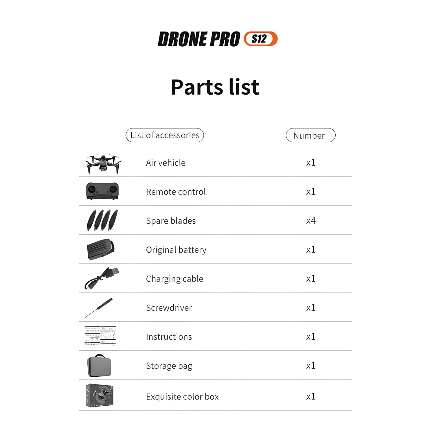 Packing list: Flyer *1, remote control *1, manual *2, screwdriver *1, spare main airfoil *4, protective frame *4, USB charging cable *1