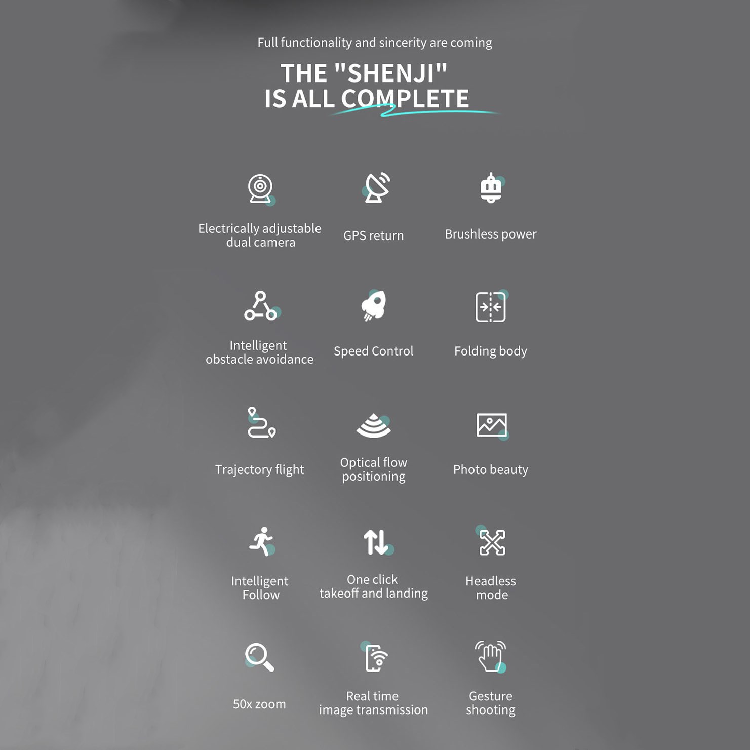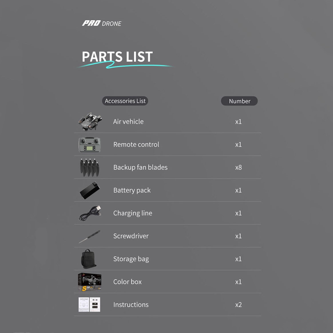 Features: Intelligent four-sided obstacle avoidance, GPS accurate positioning, mechanical self-stabilizing gimbal, set of surround flight, trajectory flight, intelligent follow the flight, a key to return to the flight, low battery return to the flight, lost return to the flight, dual-camera switching, MV recording and sharing, gesture photo, gesture video, dual-camera switching beautiful body, ABS high-toughness case, super drop-resistant, omni-directional LED light