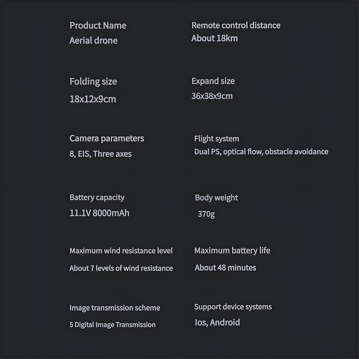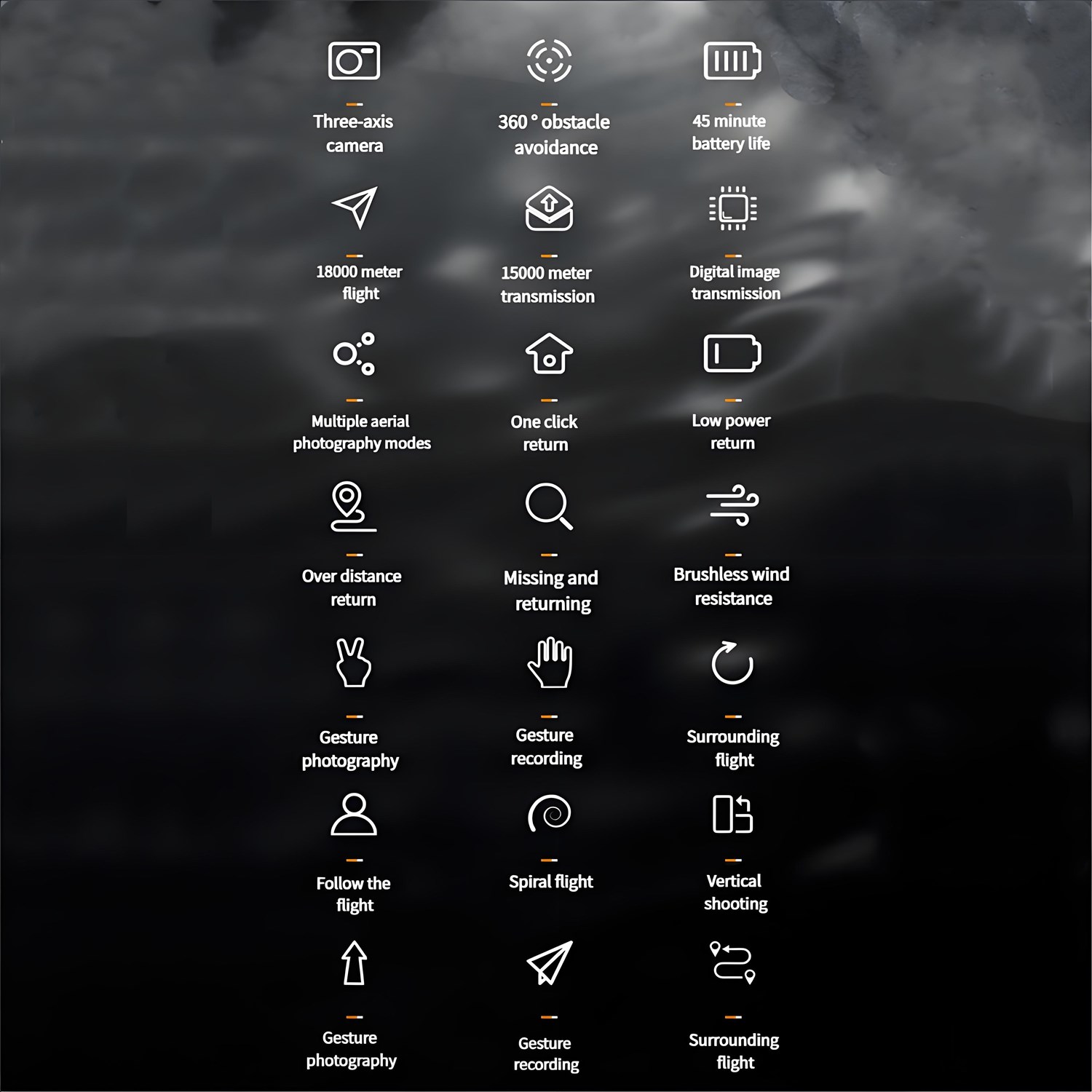 Features: ultra-long endurance, GPS/optical flow hovering, GPS/optical flow dual positioning, GPS satellite positioning, automatic return to home (low power return to home, over distance return to home, lost return to home, etc.), three-axis camera, 18,000-meter flight, a variety of aerial photography modes, 360 ° obstacle avoidance, 15,000-meter transmission, a key return to home, 45-minute endurance, digital mapping, low power return to home, over distance return to home, lost return to home, brushless Wind resistance, gesture photo, gesture video, surround flight, follow flight, gesture photo, spiral flight, gesture video, vertical screen shooting, surround flight
